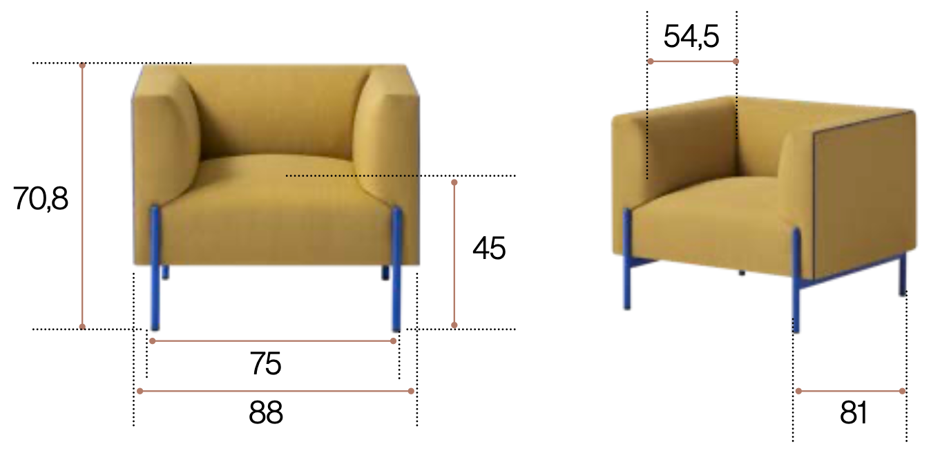 | Tugitool Kõrgus 70,8 cm Laius 88 cm Sügavus 81 cm Istumisosa sügavus 54,5 cm Istumisosa kõrgus 45 cm |