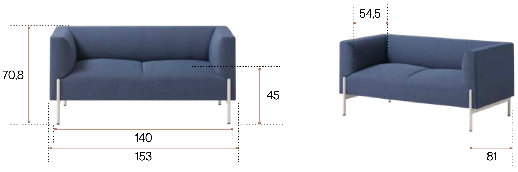 | 2-kohaline diivan Kõrgus 70,8 cm Laius 153 cm Sügavus 81 cm Istumisosa sügavus 54,5 cm Istumisosa kõrgus 45 cm |