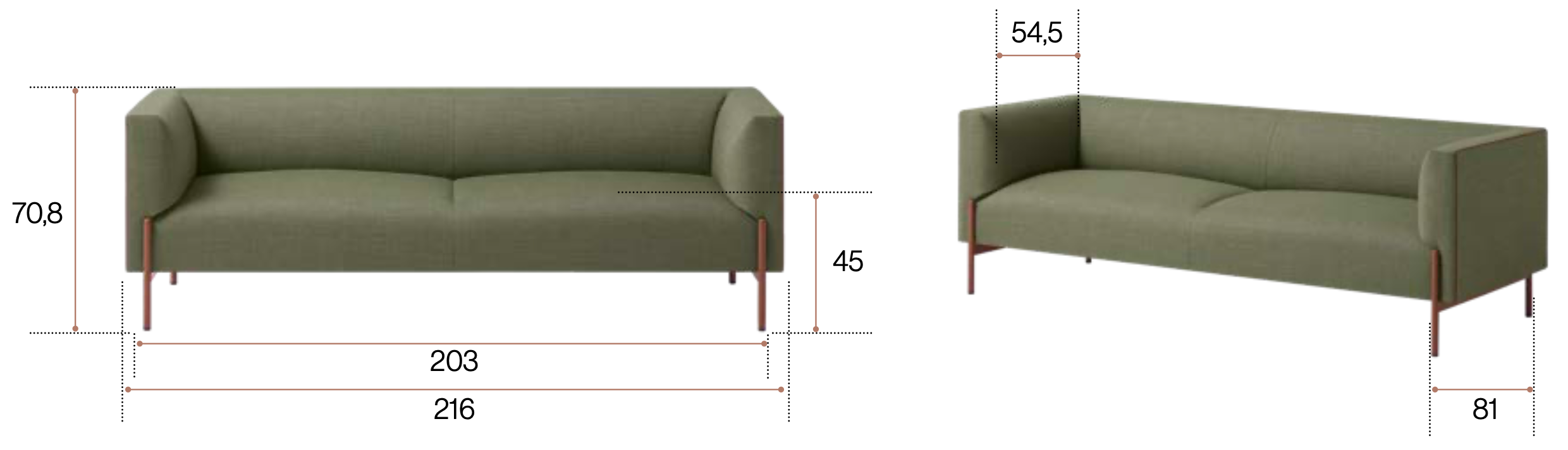 | 3-kohaline diivan Kõrgus 70,8 cm Laius 216 cm Sügavus 81 cm Istumisosa sügavus 54,5 cm Istumisosa kõrgus 45 cm |